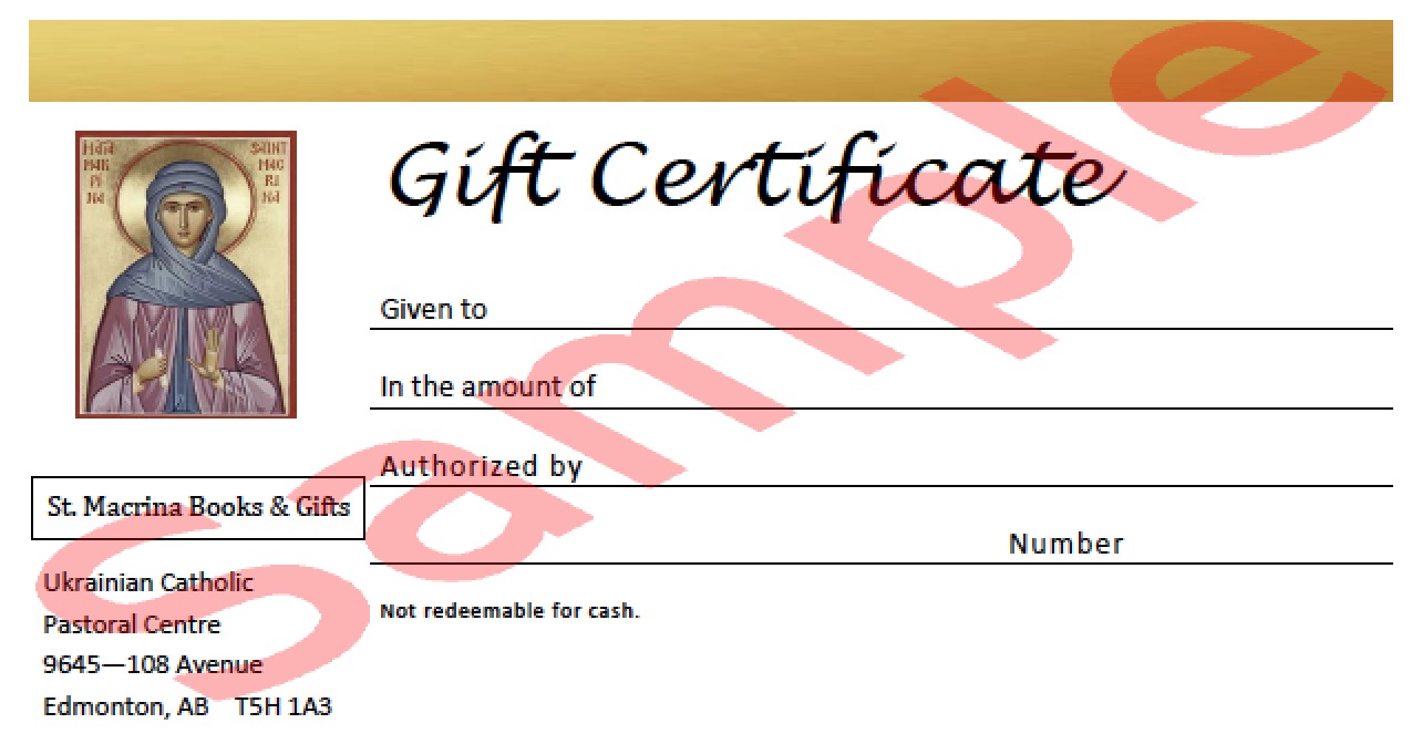 As well, we now have gift certificates for our little store at the Pastoral Centre, St. Macrina Books and Gifts. You can stop by the Pastoral Centre and fill out a gift certificate (that doesn’t expire) for any amount.