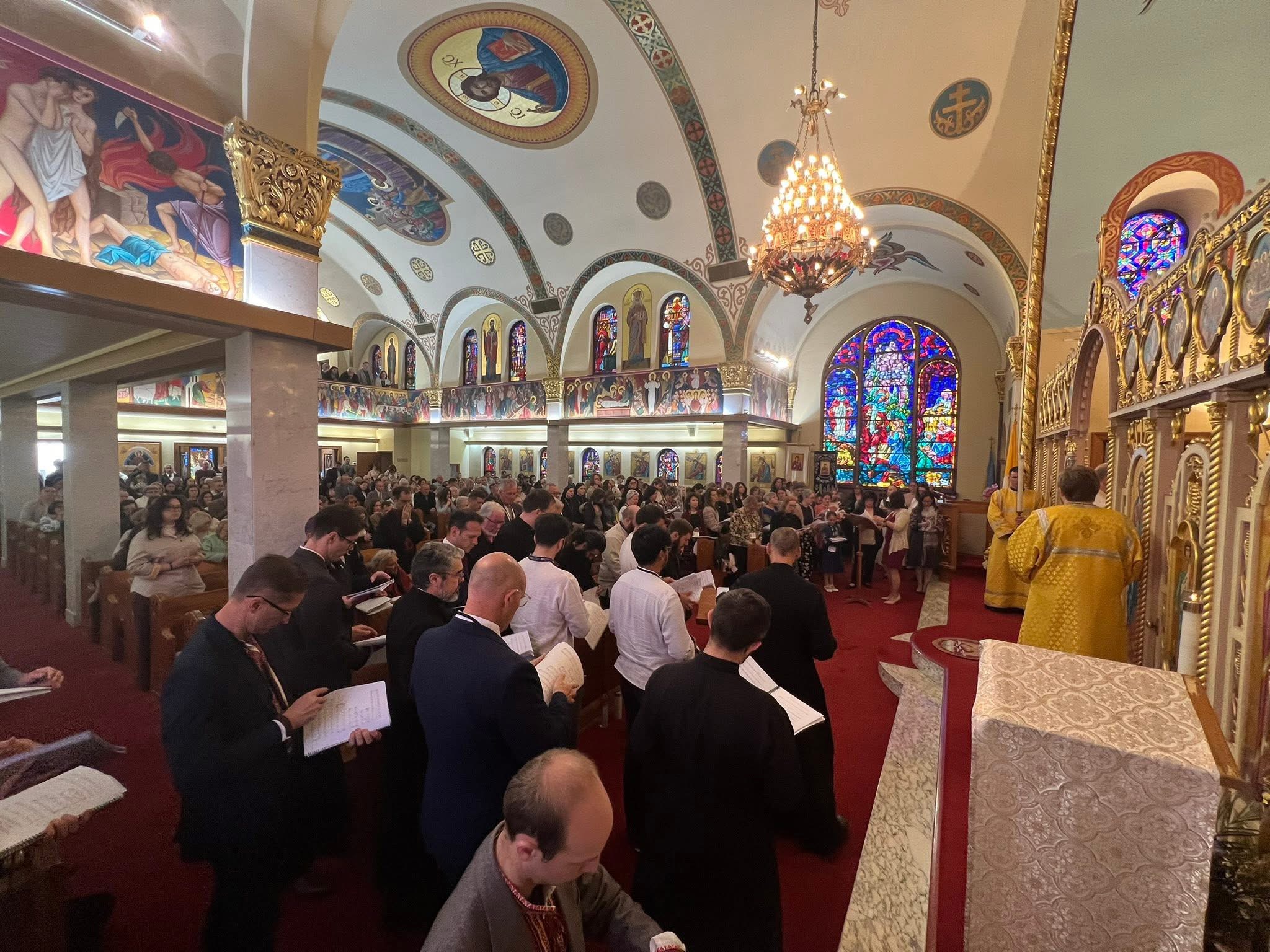 The third day continued with a Panakhyda with prayers for departed cantors and faithful, more workshops and rehearsals, and a Town Hall session moderated by Larissa Galadza, with a panel including Archbishop Borys and Bishop Bohdan Danylo, as well as three members of the SingCon committee: Deacon Daniel Galadza, Reader Ilya Galadza, and Melita Mudri-Zubacz. During this Town Hall, participants learned more about the important partnership between the work of SingCon and the Archpriest Roman Galadza Legacy Fund, including in efforts to foster ongoing cantor-training in the future. Meals served by parishioners, teachers, and religious sisters fostered ongoing fellowship. Saturday concluded with a three-hour Vigil, which filled the church with voices in prayer, anticipation growing for Sunday’s Hierarchical Divine Liturgy.
